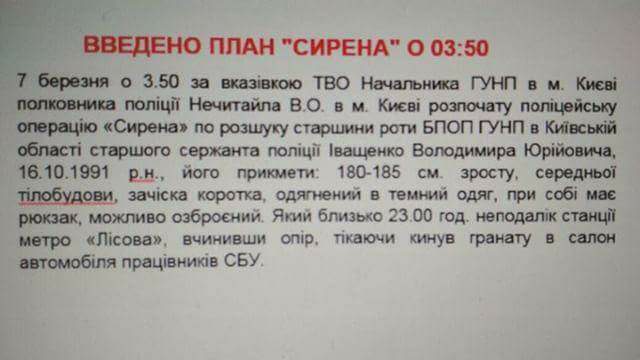 Впрочем, в сети можно встретить несколько иную ориентировку на Владимира, изданную по указанию врио руководителя столичного главка Виктора Нечитайло. Согласно ее сведениям, план "Сирена" по розыску 26-летнего старшины был объявлен спустя пять часов после ЧП у метро "Лесная" – в 03:50 среды.