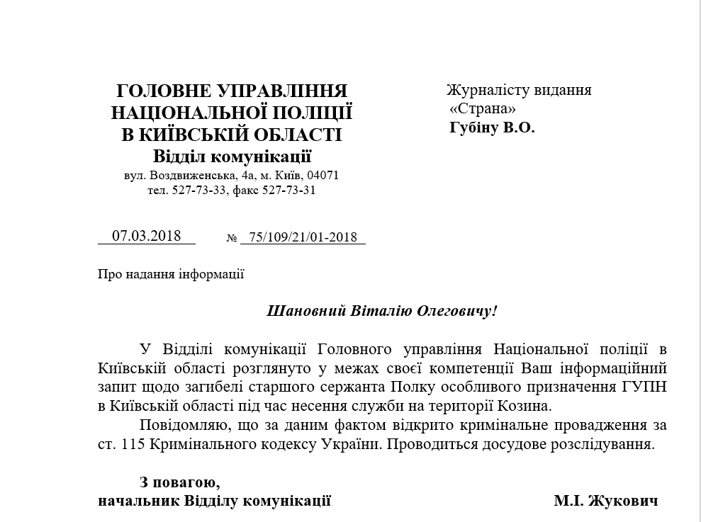 7 марта был получен ответ за подписью начальника отдела коммуникации Нацполиции Киевской области Николая Жуковича. В нем говорится, что по факту смерти старшего сержанта на территории поселка Козин возбуждено уголовное дело по ст.115 УК Украины ("Умышленное убийство").