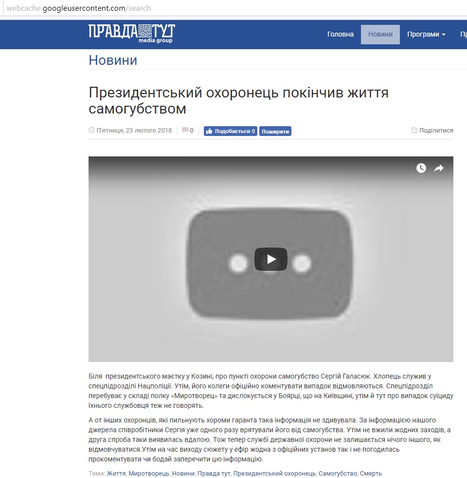 Заметка, посвященная суициду Галасюка, называлась "Президентский охранник покончил жизнь самоубийством". В ней говорилось о том, что счеты с жизнью сотрудник спецподразделения Нацполиции свел в пункте охраны президентского дома в Козине. Вот как выглядела она на сайте: