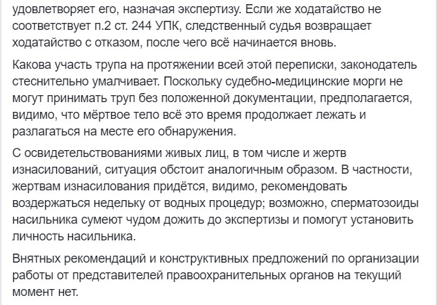 "С освидетельствованиями живых лиц, в том числе и жертв изнасилований, ситуация обстоит аналогичным образом. В частности, жертвам изнасилования придется, видимо, рекомендовать воздержаться недельку от водных процедур; возможно, сперматозоиды насильника сумеют чудом дожить до экспертизы и помогут установить личность насильника", – предполагает эксперт.