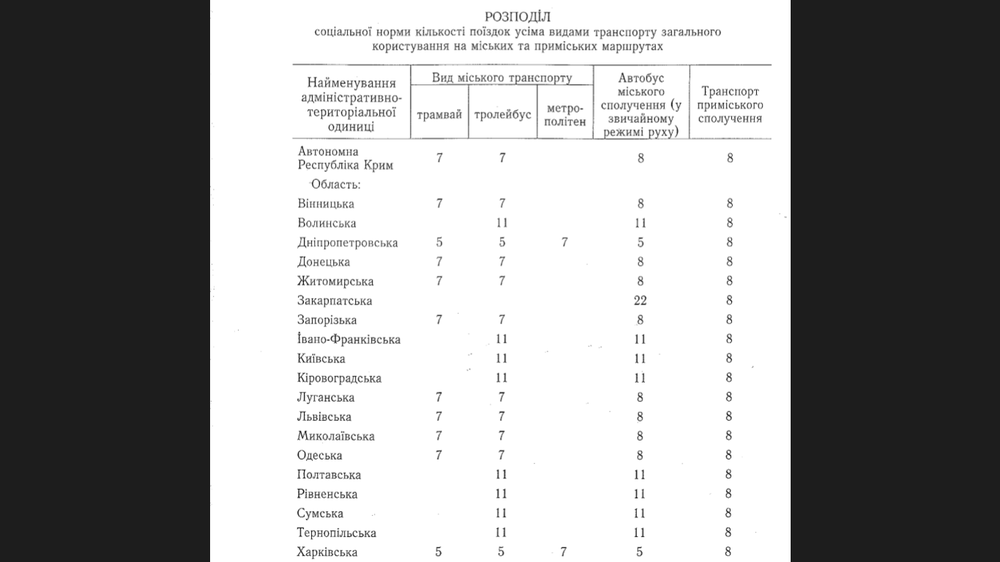 К примеру, жителям Винницкой области положено по 7 поездок на трамвае и троллейбусе, 8 – на автобусах по городским маршрутам и 8 – на пригородном транспорте (автобус, электричка). В Волынской области – по 11 поездок на троллейбусе и автобусе и 8 – на пригородном транспорте. В Днепропетровской, Харьковской областях и Киеве – по 5 поездок на троллейбусе, трамвае и автобусе, 7 – на метро и 8 – на пригородных маршрутах и т.п.