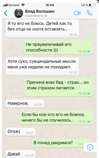 "Я его не боюсь. Детей как-то без отца не охота оставлять. Хотя, с..., суицидальные наклонности мысли меня уже неделю не покидают", - написал Волошин собеседнику за две недели до самоубийства. Далее он поделился копиями поручений главы Николаевской ОГА Алексея Савченко, а также копией выводов проверки Госаудитслужбы по поводу ремонтных работ в аэропорту.