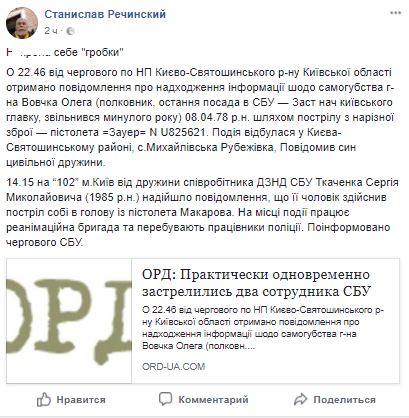Первым о трагических событиях с эсбэушниками на своей странице в Facebook сообщил журналист Станислав Речинский. Он привел сведения, напоминающие выдержки спецсообщений, которые готовятся силовиками по факту инцидентов с участием сотрудников правоохранительных органов.