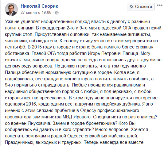 По его словам, недавно в ОГА произошел круглый стол по ситуации в Одессе на майские праздники, но на нем присутствовали только силовики, активисты (видимо, имеются ввиду члены радикальных организаций - ред.), чиновники и наблюдатели. Также Николай Скорик тревожится по поводу прибытия в Одессу первого заместителя министра МВД Сергея Ярового, которого он называет "профессиональным провокатором" и "специалистом по силовым разгонам".