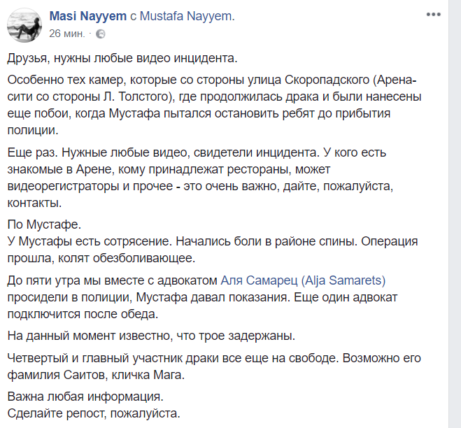 Якобы Найема опознали случайные свидетели. Они начали кричать, что в центре столицы избивают парламентария, на что его обидчики отреагировали бегством. К чести политика, он пытался их догнать. Настичь оппонентов Мустафе удалось за зданием Arena City. Впрочем, силы были неравны – здесь напавшие на Найема повалили его на землю, а сами скрылись с места происшествия на своих авто.
