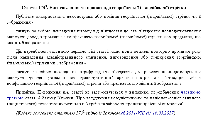 До появления этой статьи ношение ленты официально было не запрещено. Тем не менее различные "активисты" после победы Майдана регулярно требовали и от прохожих на улицах, и от водителей машин снять такую ленту. Нередко конфликты заканчивались избиениями носителей лент.