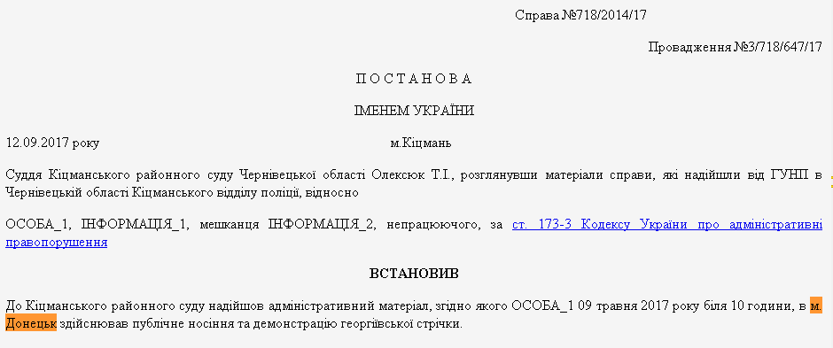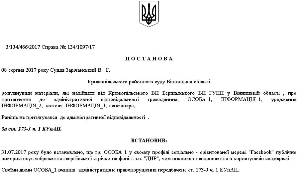 Крыжопольский суд 8 августа прошлого года оштрафовал на 850 грн плюс 320 грн судебного сбора местного пенсионера. Его вина состояла в том, что в своем профиле в соцсети Facebook он публично использовал изображение георгиевской ленты на фоне "ДНР", чем якобы вызвал недовольство у пользователей соцсети. Которые, очевидно, и доложили "куда следует" о нарушителе: