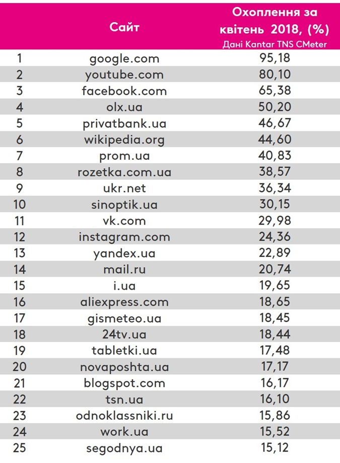 Данные desktop-исследования организации Kantar TNS CMeter за апрель этого года несколько отличаются от данных SimilarWeb: здесь ВК занимает 11-е место в общем рейтинге сайтов Украины, "Яндекс" – 13-е, следом за ним идет Mail.ru, а "Одноклассники" находятся на 23-м месте.