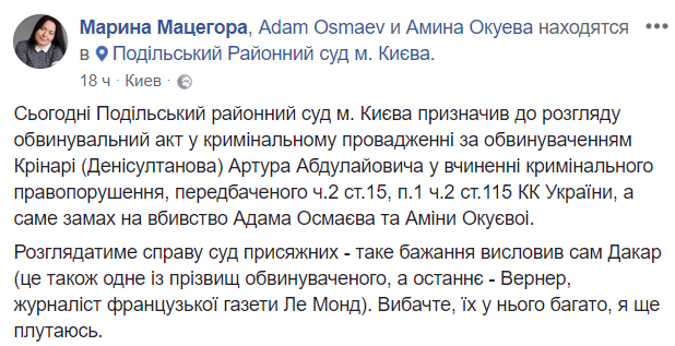 Оппонента добровольцев АТО на Подоле по-прежнему "проводят" по статье об убийстве двух и более лиц (ч.2 ст.115 УК Украины), а также незаконном хранении оружия (ч.1 ст.263 УК Украины). Следствие настаивает, что "киллер Кадырова" действовал в два этапа. Сначала под личиной французского журналиста Алекса Вернера он втирался в доверие Адама и Амины. А уже после установления приятельских отношений намеревался ликвидировать пару из-за ее активной проукраинской позиции и участия в АТО в так называемом "чеченском батальоне".