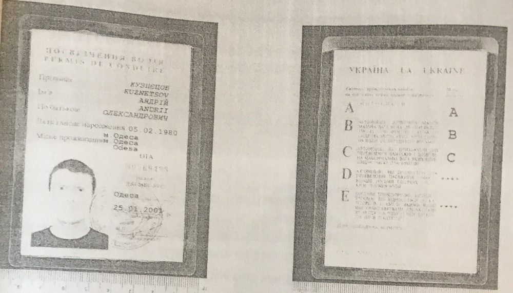 Эксперты установили, что данный бланк подлинный и не содержит каких-либо признаков подлога (включая отсутствие признаков вклеивания фотографии). Но в Одессе, где якобы выдавался этот документ, данное водительское удостоверение не числится в базе выдачи. А сам "Андрей Кузнецов" не состоится ни в одной базе учета граждан Украины.