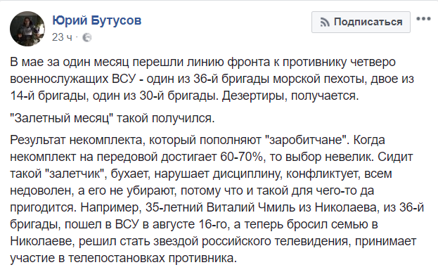 Результат некомплекта, который пополняют "заробитчане". Когда некомплект на передовой достигает 60-70%, то выбор невелик. Сидит такой "залетчик", бухает, нарушает дисциплину, конфликтует, всем недоволен, а его не убирают, потому что и такой для чего-то да пригодится. Например, 35-летний Виталий Чмиль из Николаева, из 36-й бригады, пошел в ВСУ в августе 2016-го, а теперь бросил семью в Николаеве, решил стать звездой российского телевидения, принимает участие в телепостановках противника", – пишет Юрий Бутусов на своей странице в "Фейсбуке".