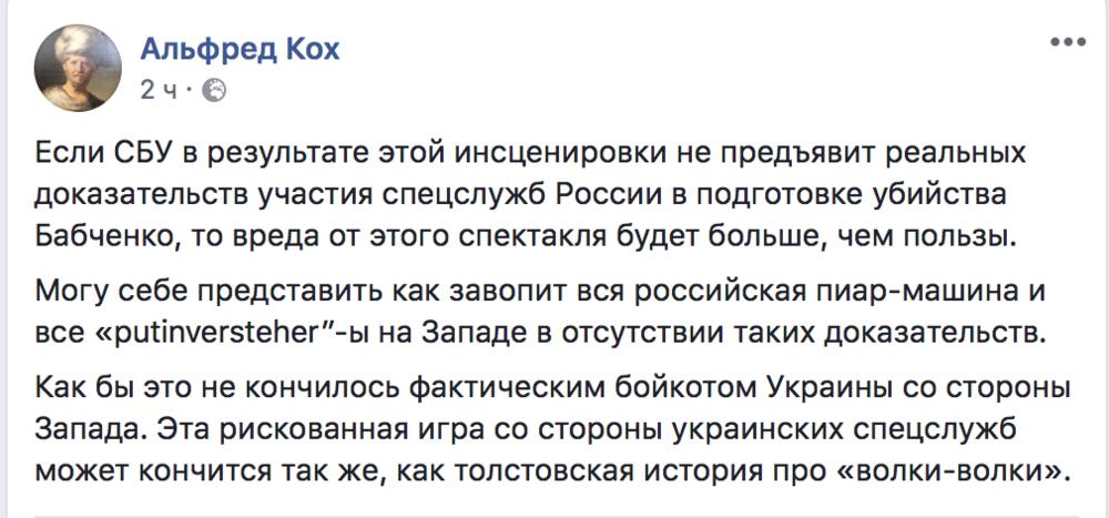 "Если СБУ в результате этой инсценировки не предъявит реальных доказательств участия спецслужб России в подготовке убийства Бабченко, то вреда от этого спектакля будет больше, чем пользы, – пишет у себя на ФБ известный российский оппозиционер Альфред Кох. – Могу себе представить, как завопит вся российская пиар-машина и все "putinversteher"-ы на Западе в отсутствие таких доказательств. Как бы это не кончилось фактическим бойкотом Украины со стороны Запада. Эта рискованная игра со стороны украинских спецслужб может кончиться так же, как толстовская история про "волки-волки". Если фотография из паспортного стола – единственное доказательство причастности российских спецслужб, то это очень идиотский аргумент: интернет наводнен фотографиями Бабченко, которые, разумеется, намного аутентичнее черно-белого снимка анфас с напряженной рожей (как все мы снимаемся на паспорт)".