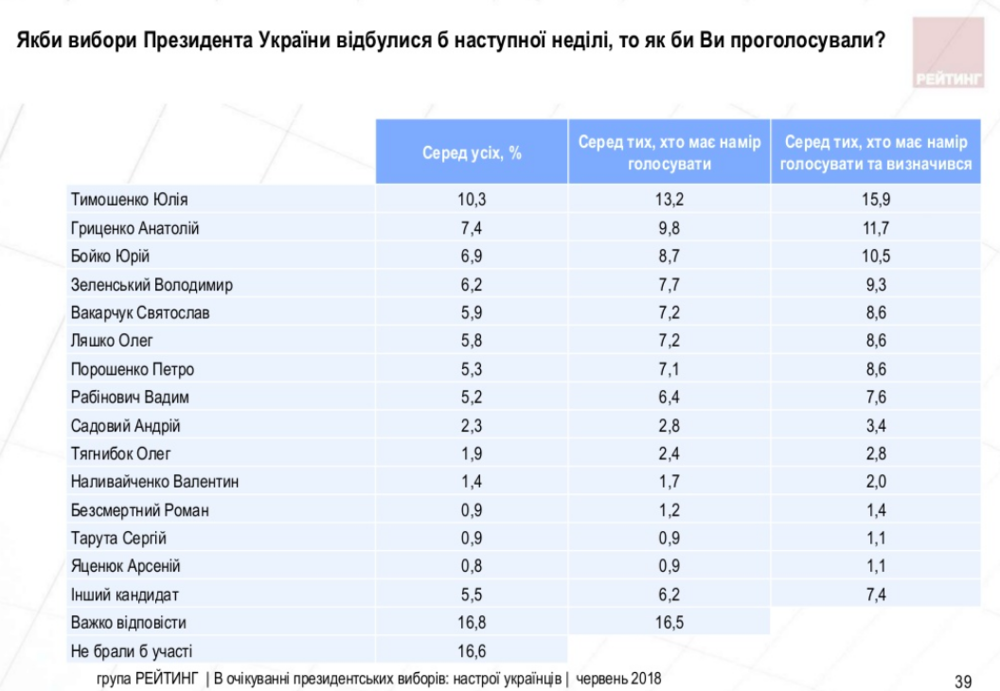 Лидирует в президентском рейтинге – Юлия Тимошенко (среди всех - 10,3%), в партийном – ее же партия "Батькивщина". На втором месте президентского рейтинга - Анатолий Гриценко (7,4%), вплотную за ним идет Юрий Бойко (6,9%). В партийном - второе место у Оппозиционного блока, а третье - у "Гражданской позиции" Гриценко. .png)