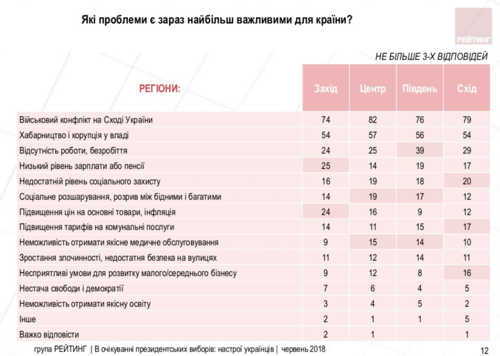Вместе с тем, опрос показал, что война на востоке Украины остается важнейшей государственной проблемой в глазах граждан (78%). О взяточничестве и коррупции, как общегосударственной проблеме, говорят 55% респондентов, безработице - 29%. Низкий уровень зарплат и пенсий, недостаточный уровень социальной защиты, социальное расслоение, повышение цен на основные товары, как проблемы на уровне страны, волнуют от 16% до 18% опрошенных.