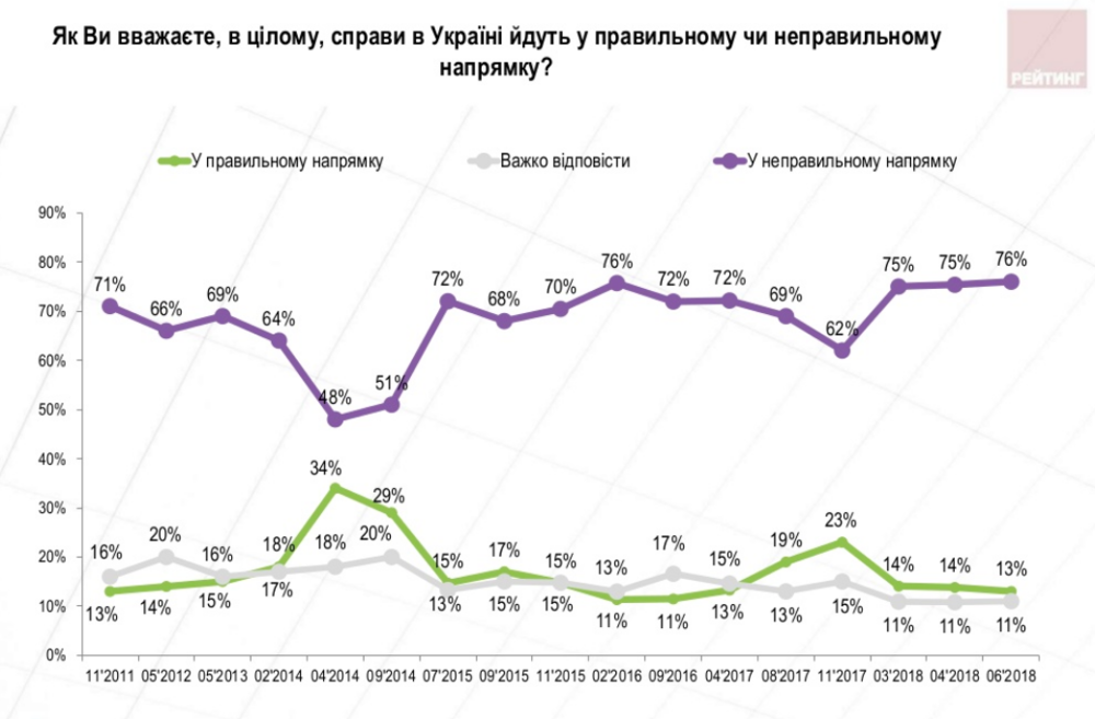 Но не менее знаковой является и вторая часть этого опроса - отношение и восприятие украинцами политической и экономической ситуации в стране. Так, оказалось, что три четверти украинцев (76%) считают, что Украина движется в неправильном направлении. Относительно меньше пессимизма высказывают жители центральных и западных регионов, высокий уровень критики на Юге.
