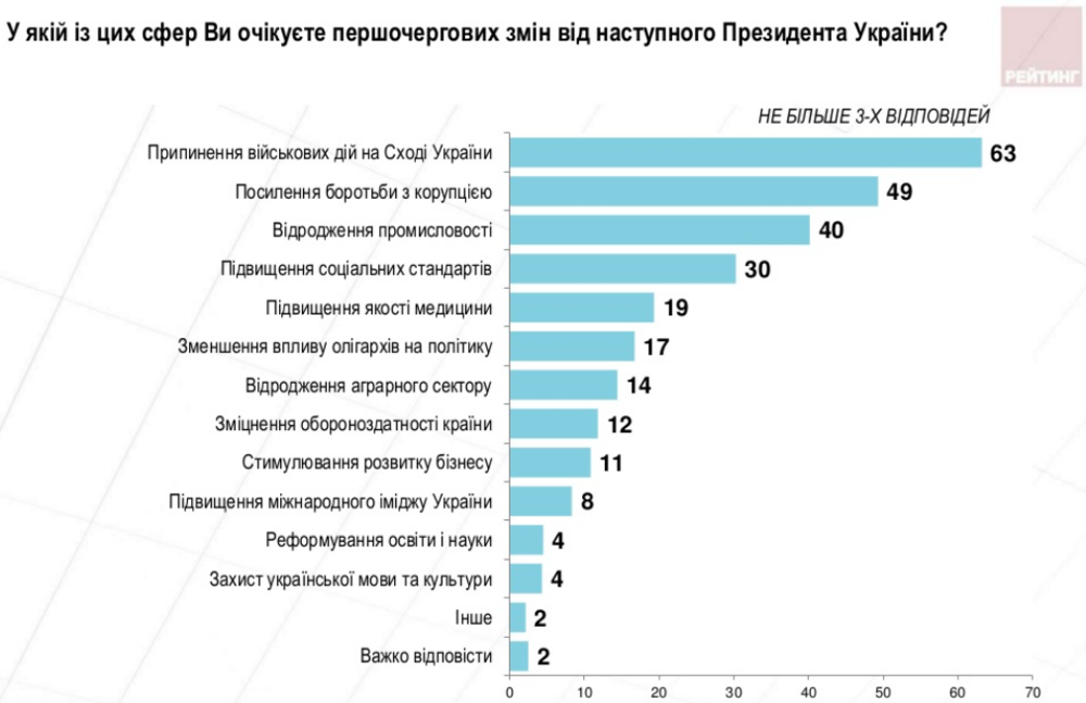 К слову, социологи уже фиксируют ожидания украинцев от будущего президента. Главные требования, которые ставят перед следующим главой государства, - прекратить военные действия на Востоке (63%), усилить борьбу с коррупцией (49%) и возродить промышленность (40%).