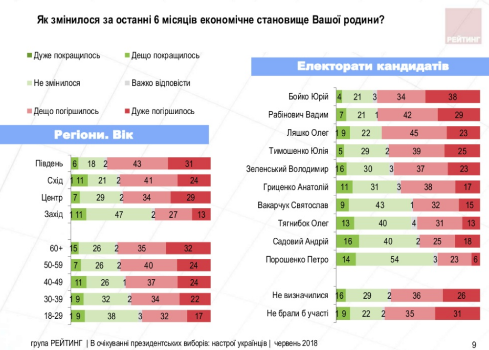 60% опрошенных утверждают, что за последние полгода экономическое положение их семей ухудшилось. 8% респондентов заявляют об улучшении экономического положения, еще 30% сообщили об отсутствии изменений. Ухудшение ситуации наиболее беспокоит представителей электорального поля Юрия Бойко и Вадима Рабиновича.