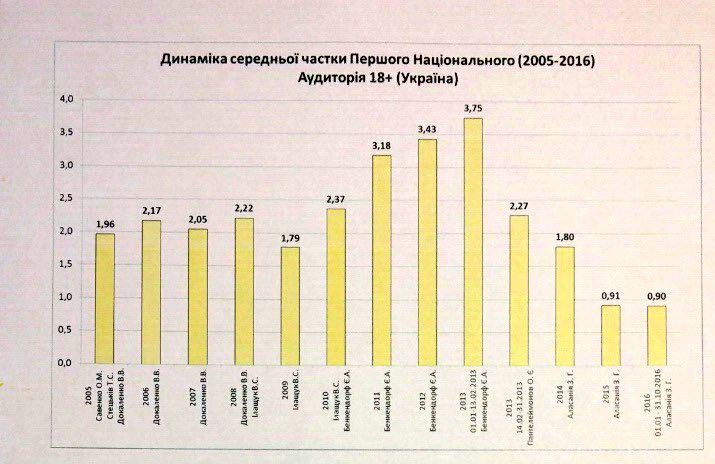 Известно, что наиболее успешным с точки зрения телесмотрения тогда еще "Первый национальный" был при Егоре Бенкендорфе (руководил НТКУ с 2010 по 2013 год). Тогда канал стабильно входил в десятку самых популярных в Украине. А за последние пять лет он скатился на аутсайдерские позиции.