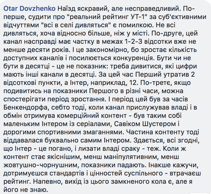В комментариях ему оппонирует журналист Отар Довженко. Мол, рейтинги падают, потому что “Общественное” придерживается стандартов.
