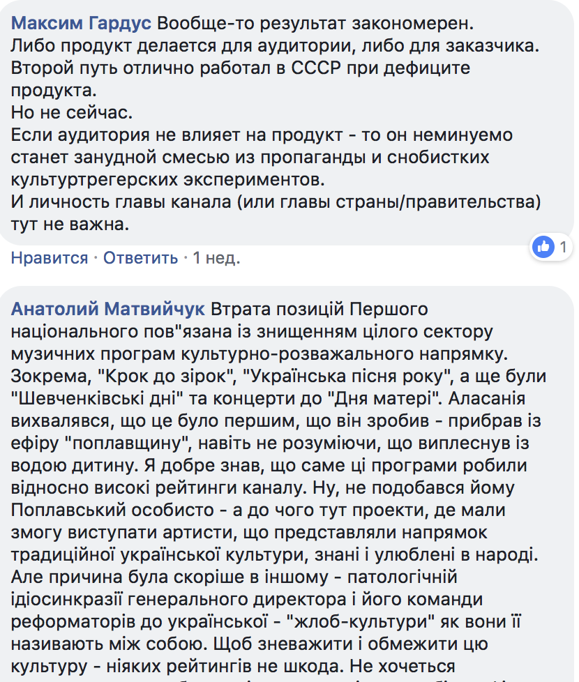У Аласании падение рейтингов признавали, но связывали это с удалением из эфира концертов Поплавского и тому подобного “низкосортного” продукта. Мол, сделали упор на качество контента, а не на количество просмотров.