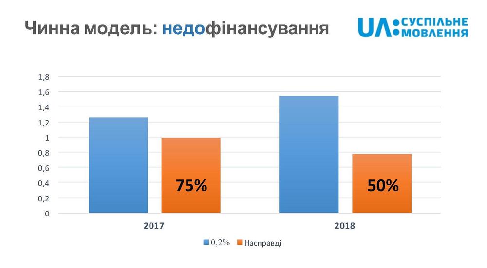 В 2017 году “Общественное” должно было получить 1,26 млрд грн, но получила на 300 млн гривен меньше. В 2018 году НОТУ полагалось 1,54 млрд грн из госбюджета, из которых телерадиокомпания в итоге получила только половину средств.