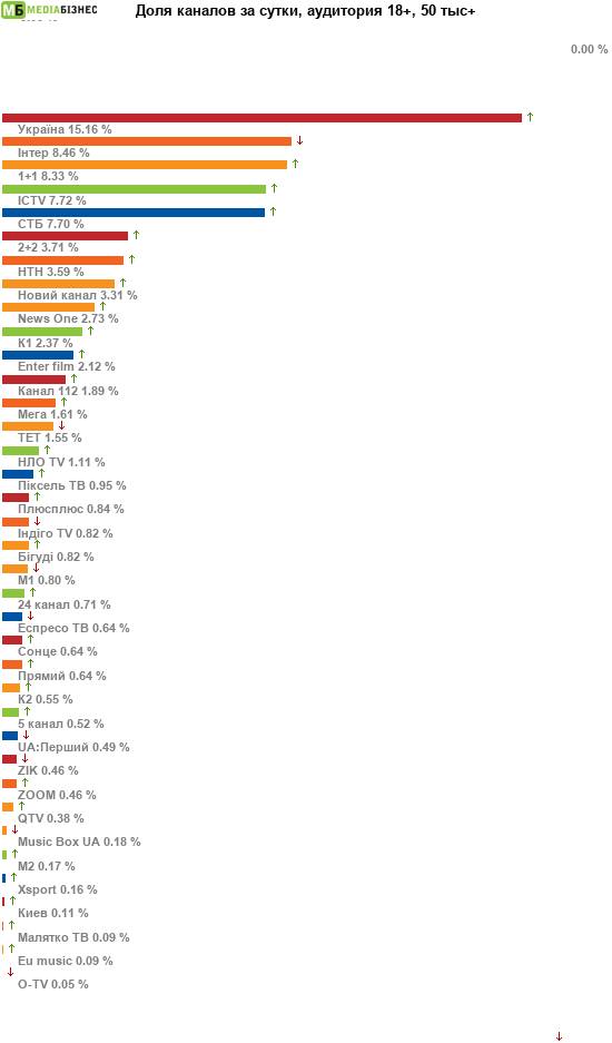Так, для населения 18+ по всей Украине "UA:Перший" - лишь 20-й канал в топе. Для той же категории, только в городах с населением 50 тысяч человек и больше, "Общественное ТВ" - 22-е в рейтинге. Среди аудитории 18-54 (в городах с населением 50+) "UA:Перший" - 24-й. А В Киеве для аудитории 18+ и вовсе 25-й.