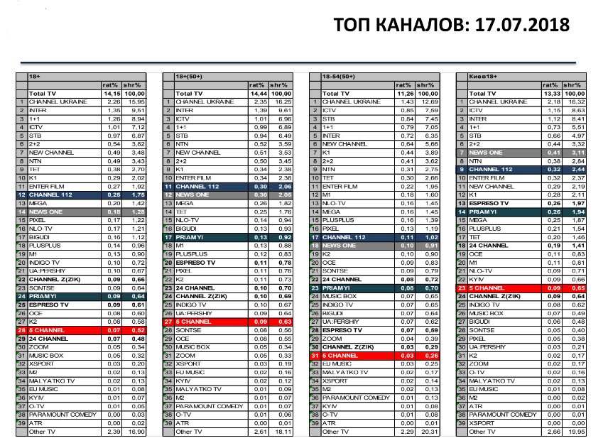 По самым свежим данным - за июль 2018 года, тенденция сохраняется. По аудитории 18+ - канал занимает 21 место. По 18+ и 50+ - 26 место. По аудитории 18-54 - 27.
