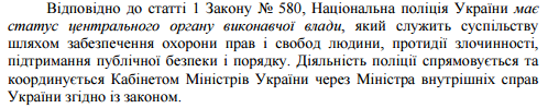 Нацполиция в профильном законе названа "центральным органом исполнительной власти". Очевидно, что ни одному из вариантов названий центральных органов власти название "Нацполиция" не соответствует: