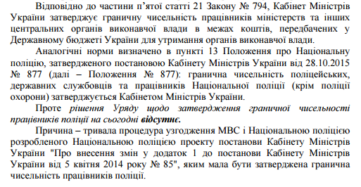 Согласно закону "О Кабинете Министров Украины", Кабмин должен утверждать предельную численность работников министерств и других центральных органов исполнительной власти. Однако предельную численность работников Нацполиции Кабмин до сих пор не утвердил.