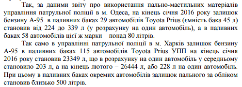 Когда машины ездили мало, списанный по нормам бензин виртуально "накапливался в баках". Согласно отчетам, остаток в баках некоторых полицейских "Toyota Prius" доходил в Одессе до 339, а в Харькове до 500 литров. Фактическая емкость бака у "Toyota Prius" - всего 45 литров. Поэтому можно догадаться, куда на самом деле девалось "лишнее" топливо: