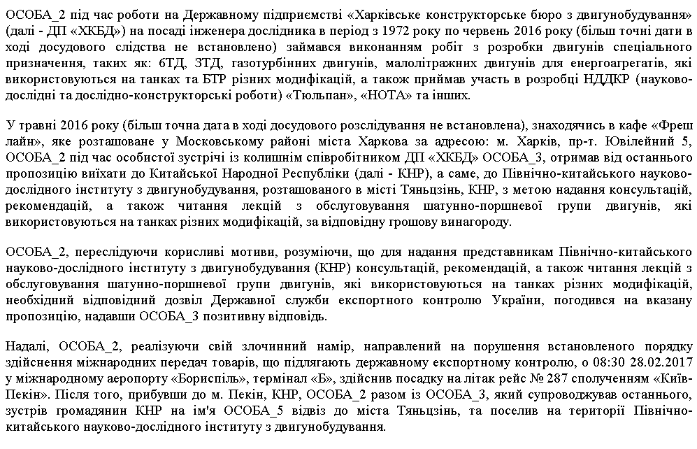 Харьковчанин получил предложение выехать в Китай для предоставления консультаций, рекомендаций, а также чтения лекций по обслуживанию двигателей, которые используются на танках различных модификаций. Почти месяц в марте 2017 года на базе Северо-китайского НИИ двигателестроения он "предоставлял консультации и рекомендации" по обслуживанию двигателей, в том числе и тех, что используются на танках и БТР.