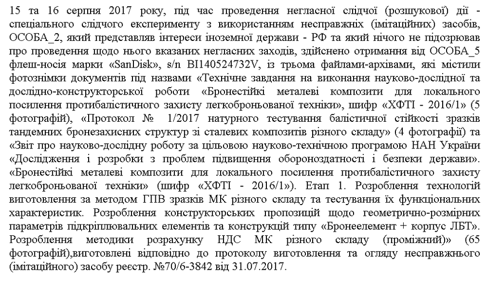 При этом, как минимум, первый документ (техзадание по бронестойким металлическим композитам), по признанию самого следствия, был ненастоящим. Его изготовили в самом СБУ, что подтверждено Протоколом изготовления и осмотра ненастоящего (имитационного) средства: