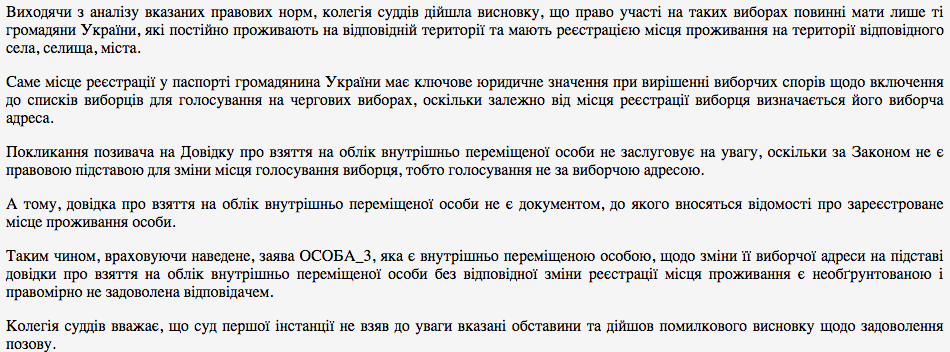 Отказ апелляция пояснила тем, что справка ВПЛ не является документом, подтверждающим место жительства. "Ссылка истца на справку о взятии на учет внутренне перемещенного лица не заслуживает на внимание", – говорится в решении апелляционного суда по делу Юлии Лементарь.