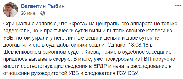 "Официально заявляю, что "крота" из центрального аппарата не только задержали, но и практически сутки били и пытали свои же коллеги из УВБ, потом украли у него личные вещи и деньги и двое суток не доставляли его в суд, дабы синяки сошли. Однако 18.08.18 в Шевченковском районном суде Киева, прямо в судебное заседание пришлось вызывать скорую", – описал свою версию истории задержанного сотрудника спецслужбы защитник на своей странице в Facebook.