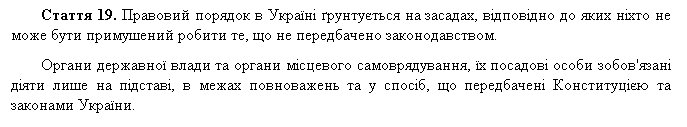 Однако, как сказано в статье 19 Конституции Украины, органы государственной власти и местного самоуправления, их должностные лица обязаны действовать только на основании, в пределах полномочий и способом, которые предусмотрены Конституцией и законами Украины: