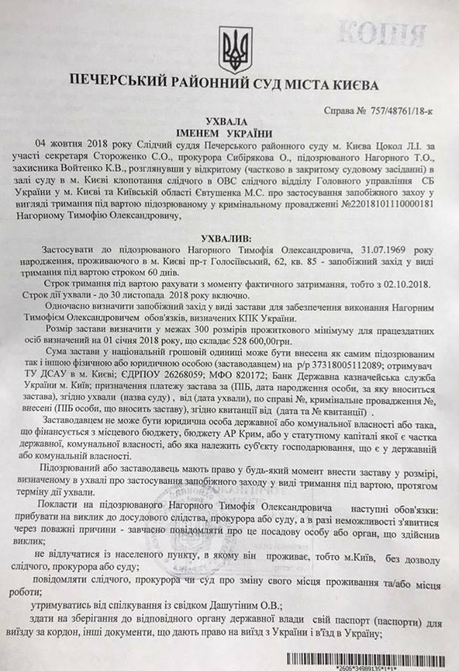 С их подачи сначала стала общеизвестной причина отсутствия Тимофея на связи. Приятели бизнесмена указали - он находится в киевском СИЗО. А в сети было обнародовано решение суда, согласно которому Нагорный был помещен под арест.