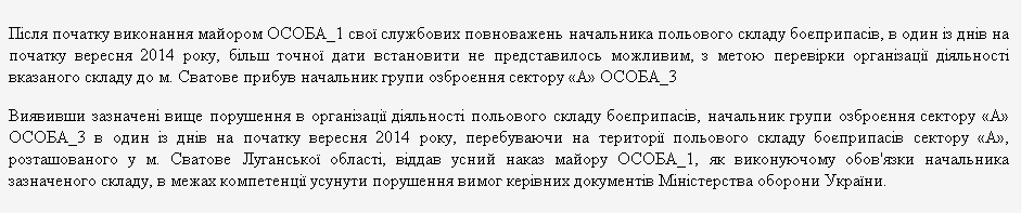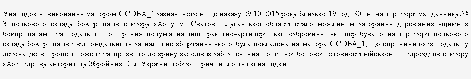 Потом из объединенного дела выделили обвинение начальнику склада майору Литвиненко. Как сказано в приговоре Сватовского райсуда, "в один из дней в начале сентября 2014 года, более точной даты установить не представилось возможным", начальник группы вооружения сектора "А" дал приказ майору Литвиненко устранить недочеты в организации склада. Майора этот устный приказ якобы не выполнил, и его обвинили в невыполнении этого, неизвестно когда отданного, приказа:
