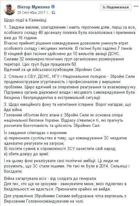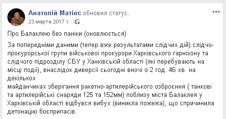 Главный военный прокурор Анатолий Матиос поначалу тоже заявлял на своей странице в Facebook, что на военном складе в Балаклее произошла диверсия: