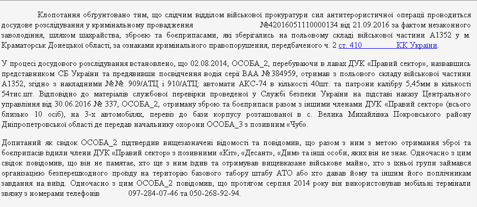 Как сказано в определении, 2 августа 2014 года на полевой склад в/ч А1352 в г. Краматорск Донецкой области, где тогда тоже хранились боеприпасы чисти, явился некий член Добровольческого украинского корпуса (ДУК) "Правый сектор".