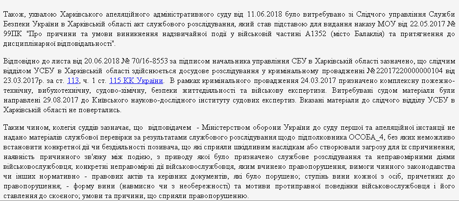 В итоге, разные правоохранительные органы вели два расследования параллельно. Военная прокуратура расследовала версию о том, что к пожару и взрывам в Балаклее привела халатность военнослужащих, а СБУ вело следствие по статье 113 "Диверсия" Уголовного кодекса.