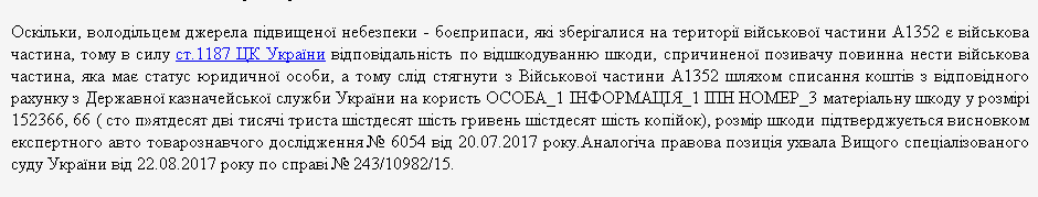 Взыскивать ущерб с Министерства обороны и СБУ суд не стал. По документам, владельцем взорвавшихся боеприпасов была именно военная часть как отдельное юридическое лицо. А по статье 1187 Гражданского кодекса Украины ответственность по возмещению ущерба от источника повышенной опасности должно то лицо, которому этот источник опасности принадлежит. Поэтому суд решил, что ответственность должна нести только военная часть, а не Министерство обороны. При этом суд сослался на аналогичную правовую позицию, которая была изложена Высшим специализированным судом Украины 22.08.2017 года в постановлении по делу № 243/10982/15: