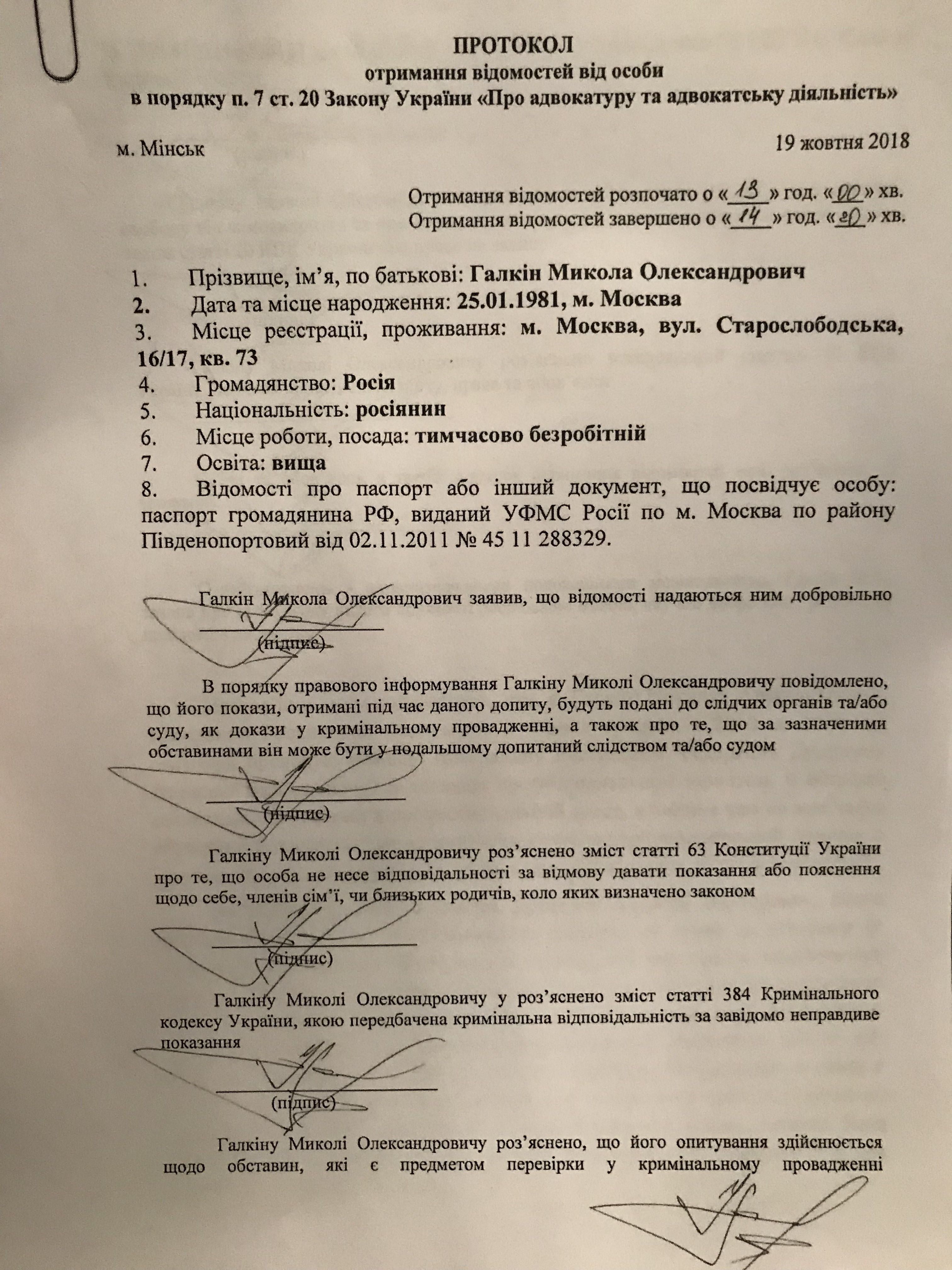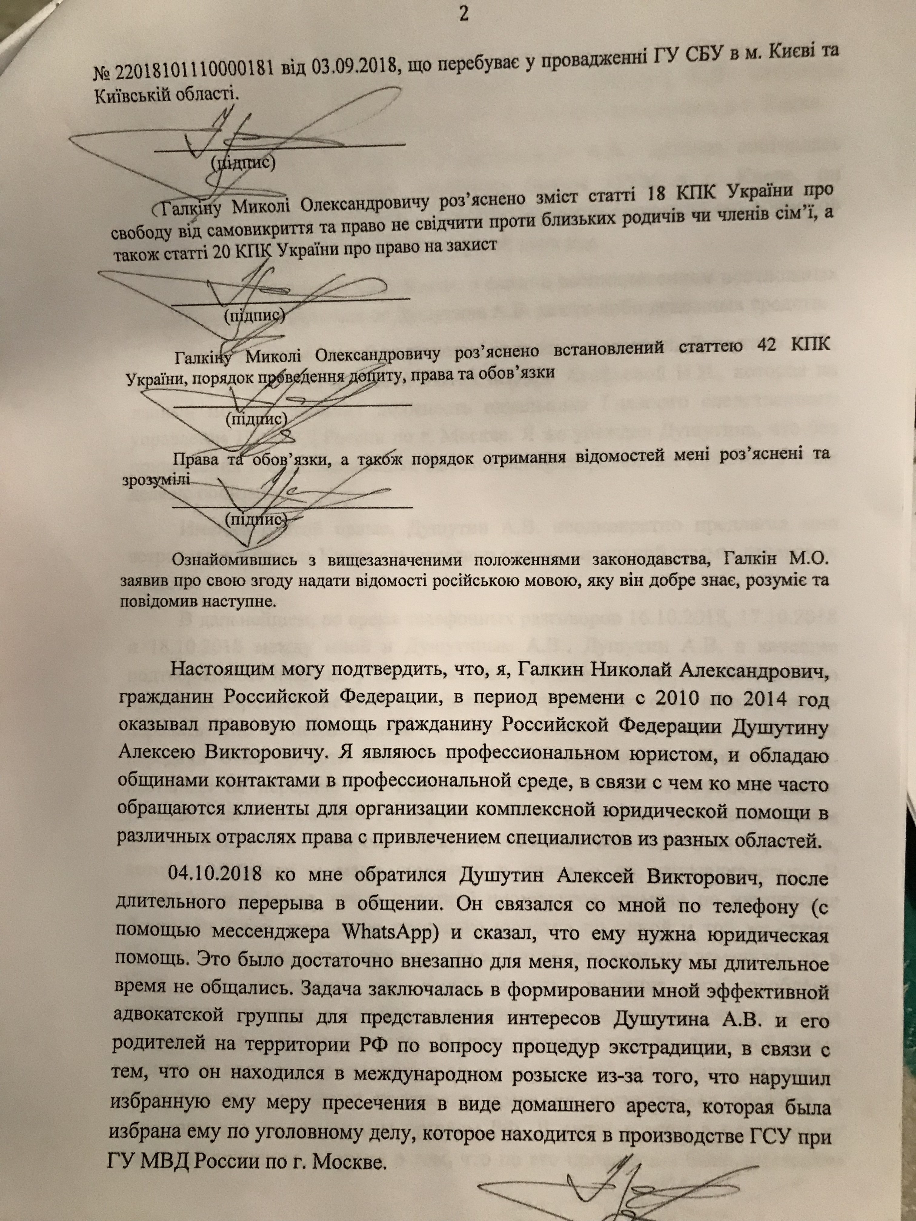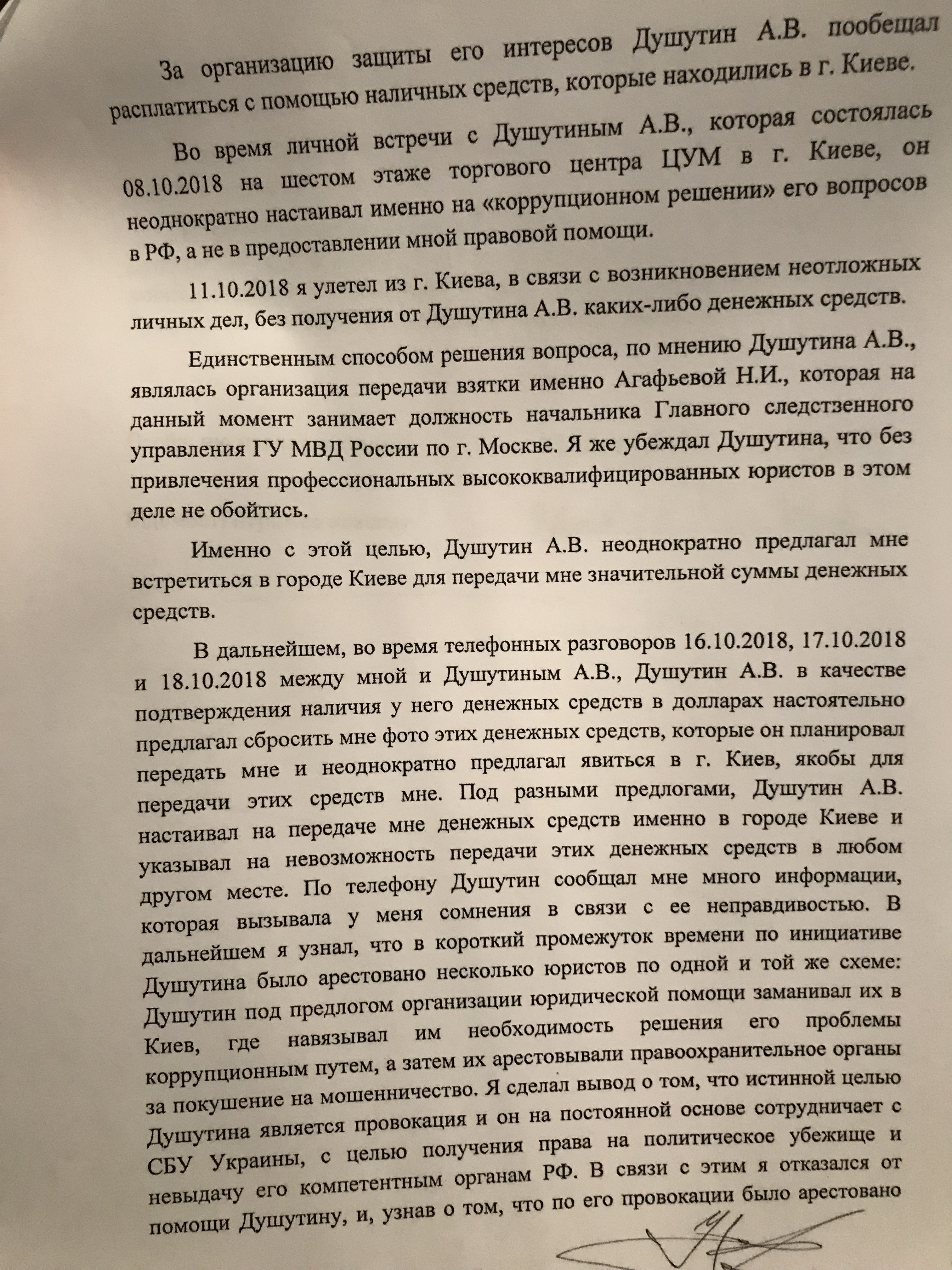 Галкин прибыл в Киев, где 8 октября (то есть, уже после задержаний и арестов его коллег Левчука и Филимонова, а также Нагорного) встречался с Душутиным. Последний якобы склонял защитника к решению его проблем коррупционным путем - путем передачи взяток руководителям МВД России. Но "окучить" Галкина по методу его коллег Алексею Викторовичу не удалось. И 11 октября защитник покинул Украину.