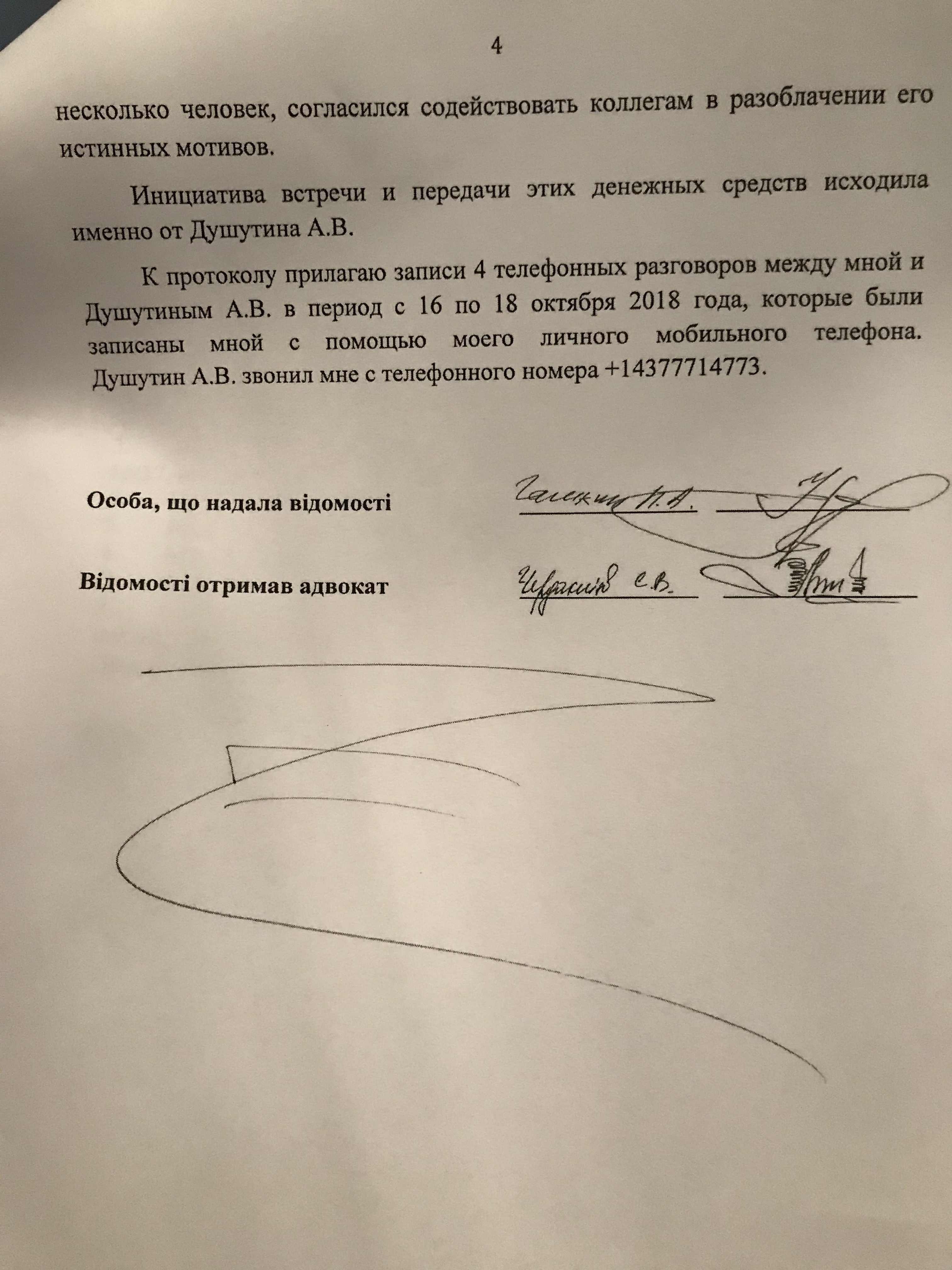 В подтверждение своих слов Галкин предоставил аудиозаписи четырех телефонных разговора, состоявшихся между ним и Душутиным в промежутке с 16 по 18 октября. Из них следует, что бизнесмен активно заманивал адвоката конкретно в Киев, где якобы хотел передать ему деньги для взяток российским силовикам.