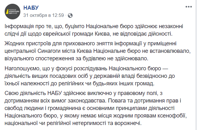 "Никаких устройств для скрытого снятия информации в помещении центральной синагоги города Киева Национальное бюро не устанавливало, визуального наблюдения за зданием не осуществляло", – отмечалось в нем.