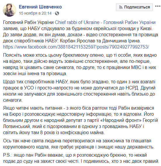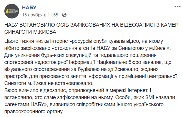 "Те лица, которых видно на видео, действительно ведут наружное наблюдение. Но, во-первых, их вряд ли интересует синагога, а во-вторых, это сотрудники МВД, и у них совсем другие имена и фамилии. Что же касается упомянутых сотрудников НАБУ, то один из них работает у УСО (управление специальных операций ведомства. – Прим. ред.) и просто-напросто не может привлекаться к НСРД. А второе лицо никогда не привлекалось для внешнего наблюдения даже близко к синагоге", – написал Шевченко на своей странице в Facebook.