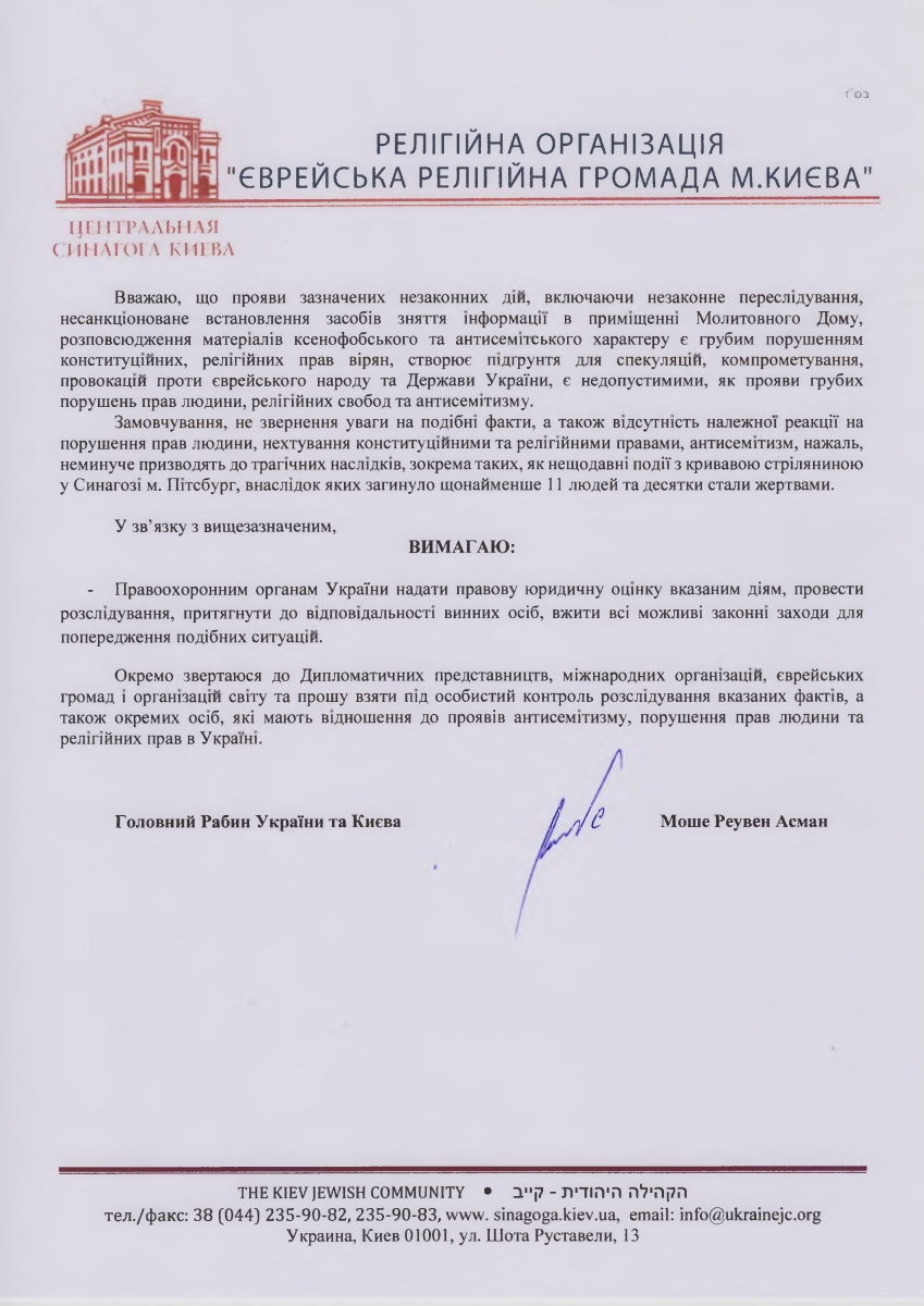 Все началось с открытого обращения главного раввина Украины и Киева Моше Реувена Асмана, который в конце октября выступил с официальным заявлением от лица еврейской общины.