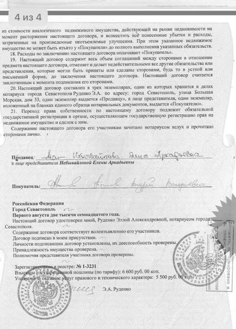 Как следует из обнародованных Ивановым документов, сделка купли-продажи была проведена в соответствии с законодательством РФ крымским нотариусом Эллой Руденко. При этом 6600 рублей ушли в казну "северного соседа" Украины. А главное - в процессе отчуждения было нарушено законодательство нашей страны.