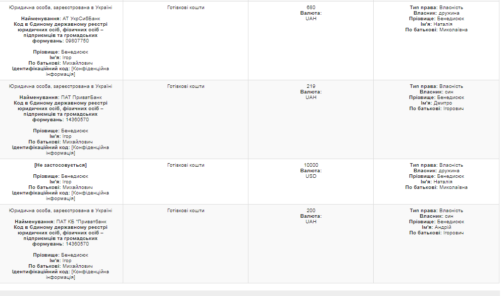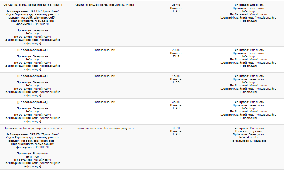 В разделе 12 "Денежные активы" декларации за 2017 год, которую Игорь Бенедисюк подавал в качестве главы ВСП он указал, среди прочего, наличные деньги - 20 тыс. евро, 15 тыс. долларов и 35 тыс. гривен. Еще он задекларировал вклады в "Приватбанке" 25 576 грн. у себя и 9 676 грн. у жены: