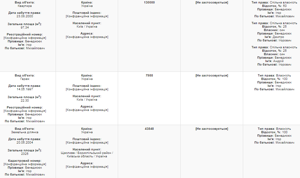 В собственности главы ВСП находятся также гараж в Киеве и участок площадью 23 сотки в Бориспольском районе. Еще Игорь Бенедисюк задекларировал квартиру в Киеве площадью 97 кв. м. Ему принадлежит половина квартиры, еще по 25 % записаны на сыновей Игоря и Андрея:
