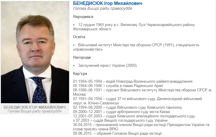 Начнем с председателя Высшего совета правосудия Игоря Михайловича Бенедисюка.